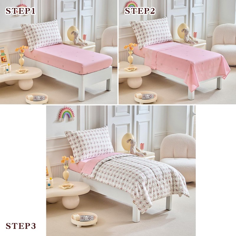 - What You Get: 4-Piece Toddler Bedding Set includes: 1 reversible comforter (42" x 57"), 1 reversible pillowcase (20" x 30"), 1 flat top sheet (45" x 60") and 1 fitted bottom sheet (28" x 52" x 8"). All pieces are measured to fit a standard size toddler bed.