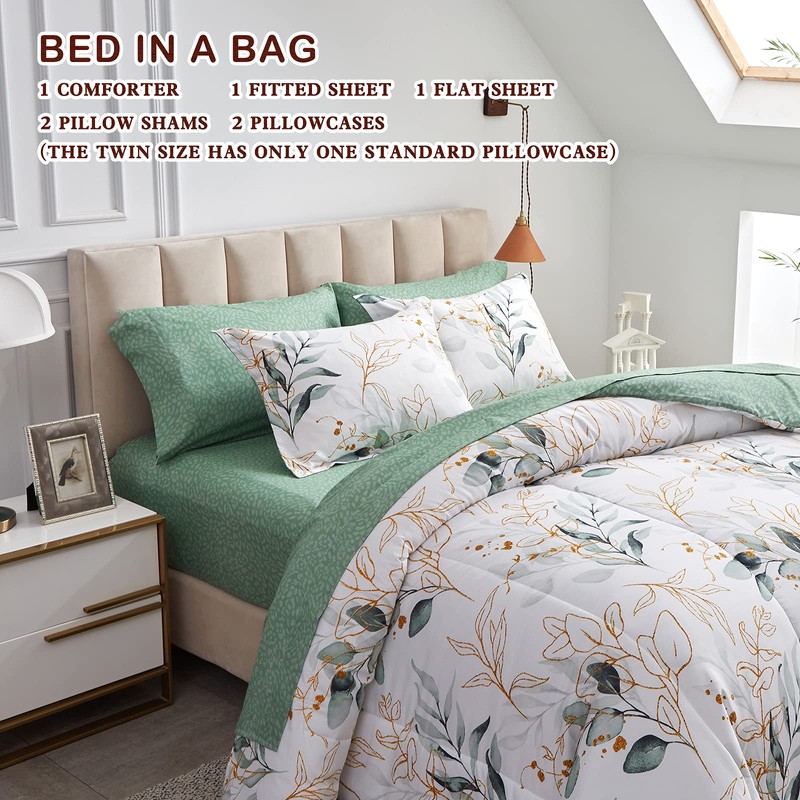 Joyreap 7 Piece Bed in a Bag King, Green Leaves Printed on White Botanical Design, Microfiber Comforter Set for All Season (1 Comforter, 2 Pillow Shams, 1 Flat Sheet, 1 Fitted Sheet, 2 Pillowcases)