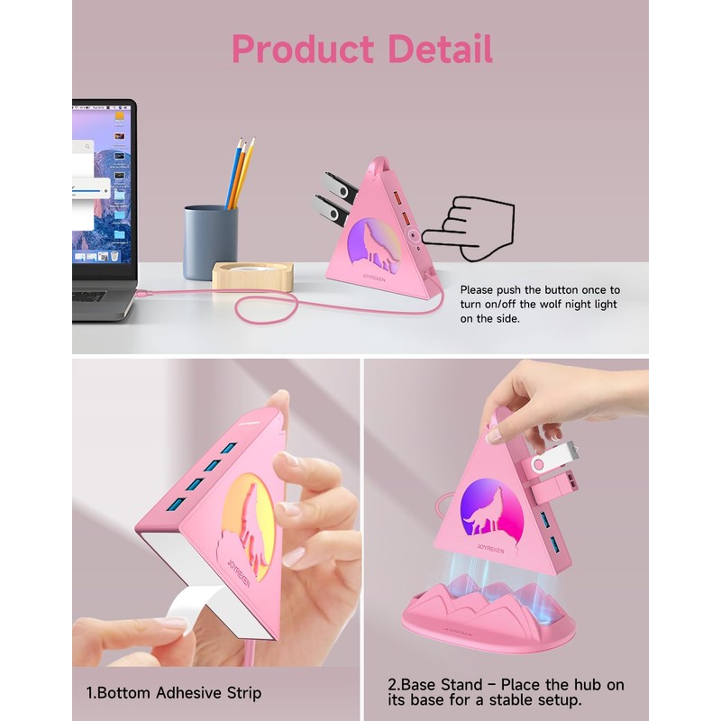 • 【Stylish RGB Wolf Design】A powered usb hub with an illuminated howling wolf icon and multicolor night light adds ambient glow and style to your desktop setup. This RGB USB hub doubles as a stylish wolf USB hub for gamers, streamers, and creative professionals.Note: Simply press the side button once to turn the night light on or off—giving you full control over your setup’s vibe.