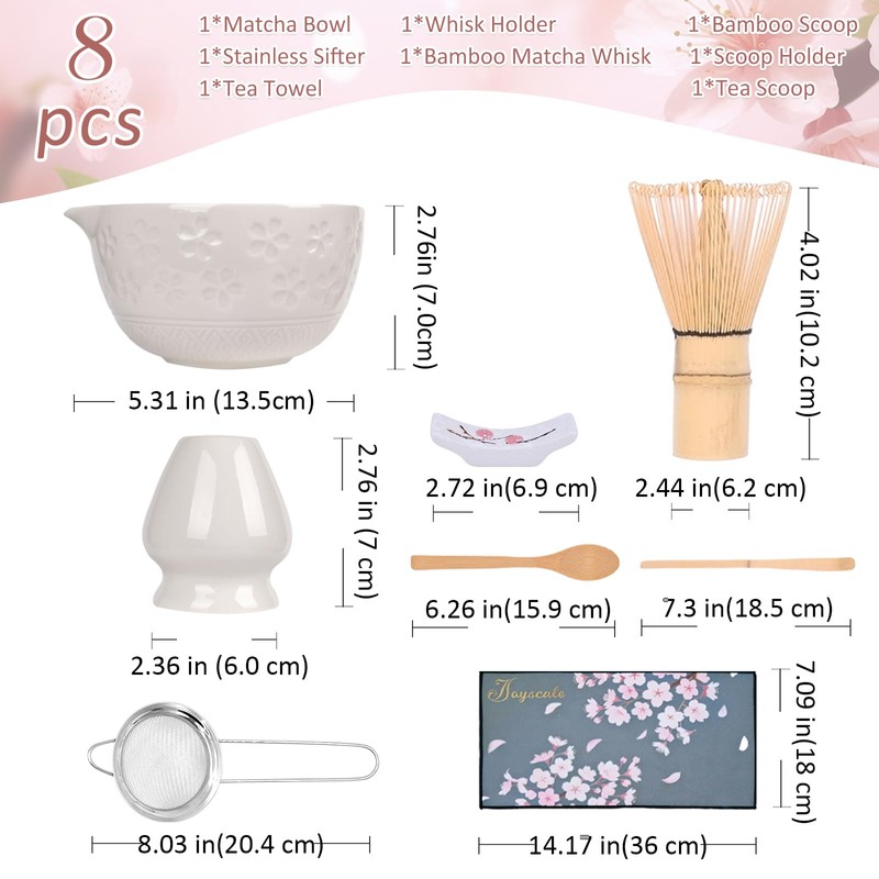 - Complete Matcha Bowl Set: The aesthetic matcha bowl and whisk set includes 8 Pcs matcha tool set: 1* ceramic matcha bowl with spout 14 oz, 1*ceramic whisk holder, 1*bamboo whisk(chasen), 1* bamboo scoop(chashaku), 1*ceramic scoop holder, 1*stainless steel sifter, 1*tea spoon, 1* tea towel. It is a perfect matcha starter kit