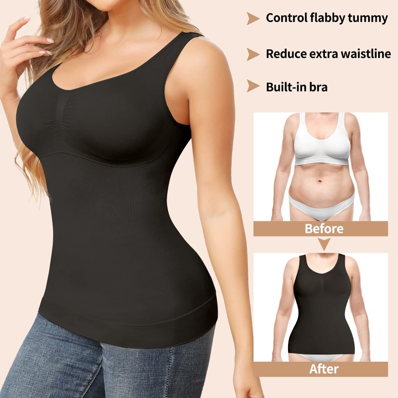 - ✅Tummy Control Tank Top Cami -- Slimming cami shaper with built in bra provides comfortably control and compression to smooth your tummy, waist, hips, back.Compression tank tops for women figures flattering fit with 2 layer fabric targeted tummy shaping, comfort for all day wearing.