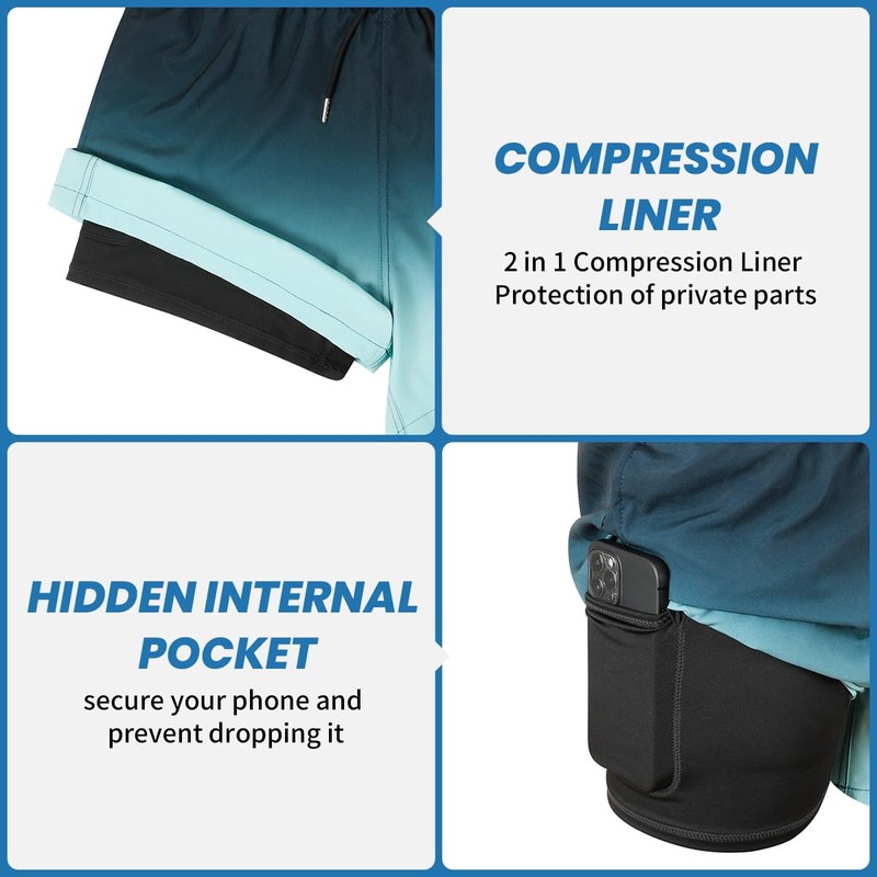 Our mens athletic shorts are designed with a 2-in-1 compression liner designed to provide support for leg muscles during exercise, and the lightweight, breathable, quick-drying fabric is suitable for athletic occasions.