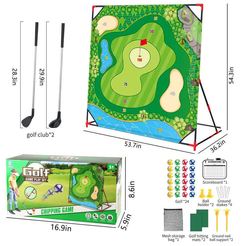 From golf chipping practice in the garden to a family yard game at the beach, this versatile set has you covered. Package includes: 1x 54"x54" Target Mat with Stand, 4x Ground Stakes, 24x Sticky Balls, 2x Clubs, 2x Hitting Mats, 1x Scoreboard, 1x Storage Bag.