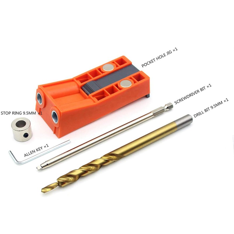 The package includes: 1 pcs twin pocket hole Jig, 1 pcs depth stopcollar, 1 pcs allen wrench, 1 pcs square driver bit, 1 pcs 3/8"(9.5mm) stepped drill Bit