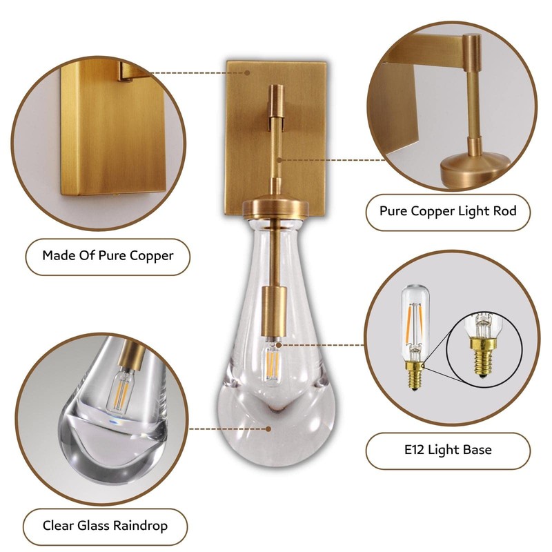 Joyunleo Brass Wall Sconces, Raindrop Sconces Wall Lighting, Wall Sconce Indoor for Living Room, Modern Wall Light Fixtures Bathroom Light Fixtures Wall Lamp for Hallway, Bedroom