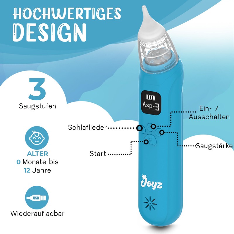 - For relaxing nights: no more crying. Turn nasal brushing into a peaceful moment with the JOYZ nasal aspirator for babies. Soothing lullabies and colourful lights create a pleasant atmosphere and make nose brushing a relaxing ritual.