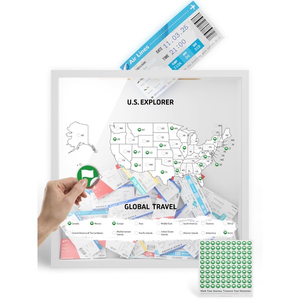 JOZidea Travel Adventure Archive Box, with Where I've Been Map for Memory, 11.4"x11.4" Shadow Box with Stickers to Mark Travel Map Tracker, Keepsake Frame with Slot for Tickets Collection(White)