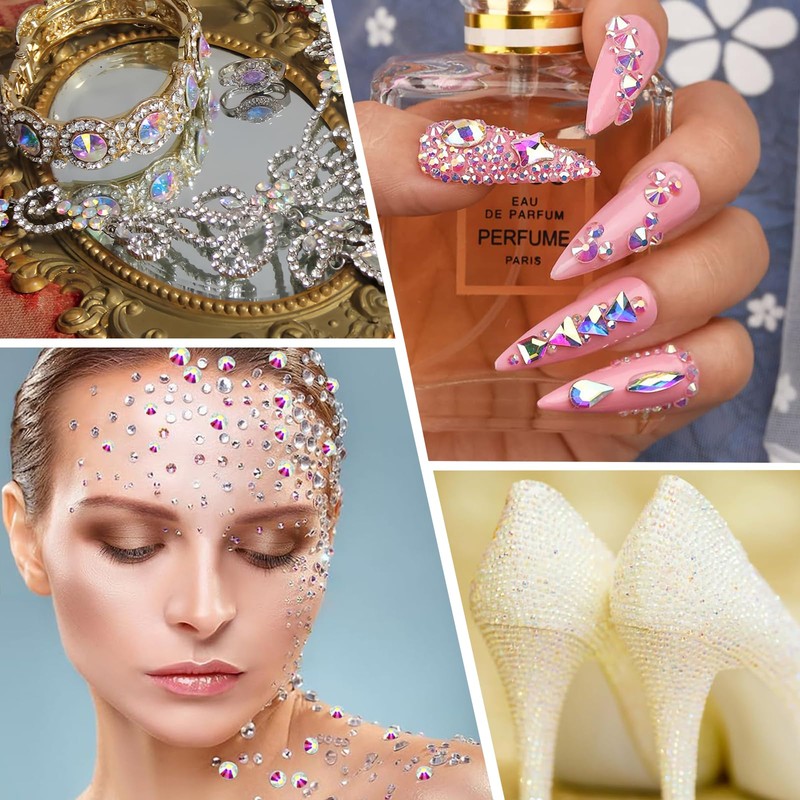 - Applicable Scenarios: Nail gems are suitable for decorating clothes, shoes, manicure, facial makeup, wedding dresses, bags, shoes, mobile phone cases, home decoration and other craft decorations. From manicure to facial makeup, from clothes to shoes, from crafts to home decoration, do whatever you want. Come and enjoy the fun of design and the beautiful versatility, it is an ideal choice for DIY enthusiasts and professional designers.