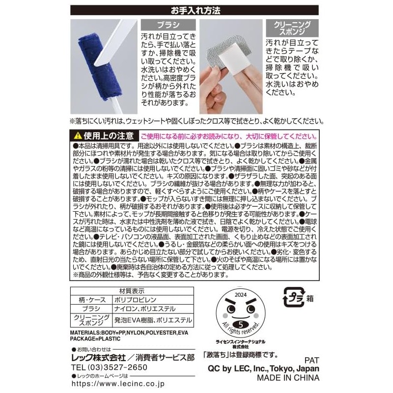 - Precautions for Use: <br>This product is a cleaning tool. Do not use for anything other than the intended purpose. <br>Do not use for cleaning metal or glass powder. <br>Please do not use the brush or cleaning surface with hard debris or sand. This may cause scratches. <br>Do not use on rough or rough surfaces. The fibers of the brush may come out. <br>If excessive force is applied, it may be damaged, so please use as to lightly glide it. <br>Do not force the mop into a gap where the tip of the mop does not fit. The brush may come off or damage the handle. <br>