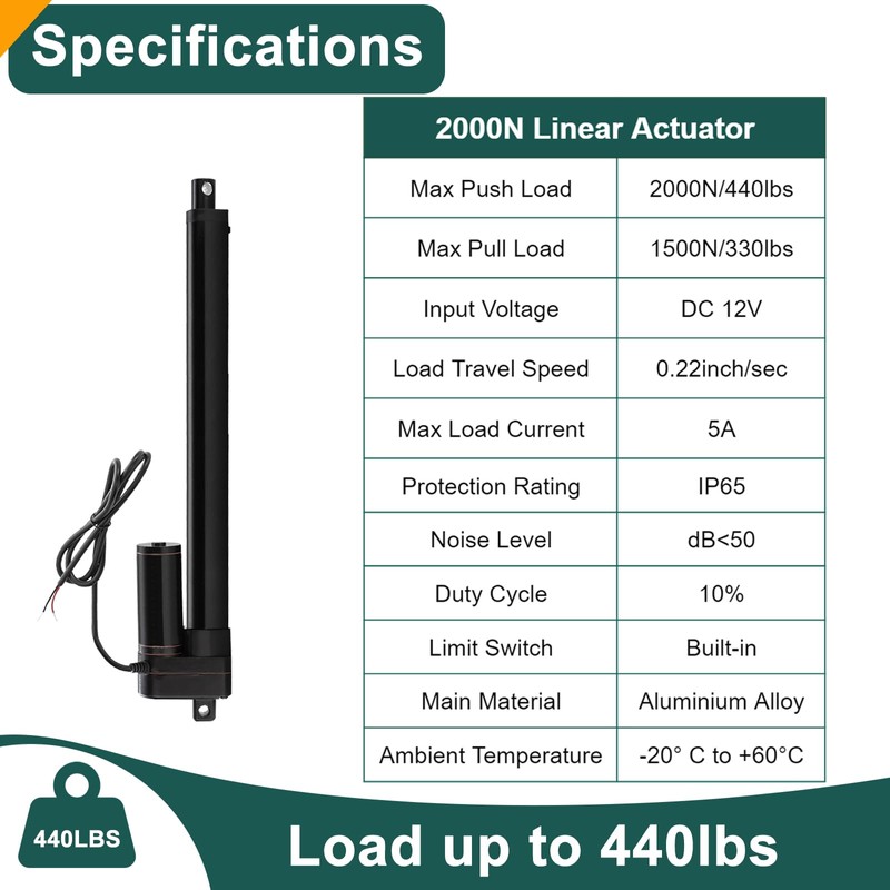 - 【Features】The linear actuator equip with high performance motor,it can provide a pushing force up to 440lbs and pulling force up to 330lbs.With self-locking function and built-in limit switch,it can be stopped at any position and automatically stop at the top and the bottom.