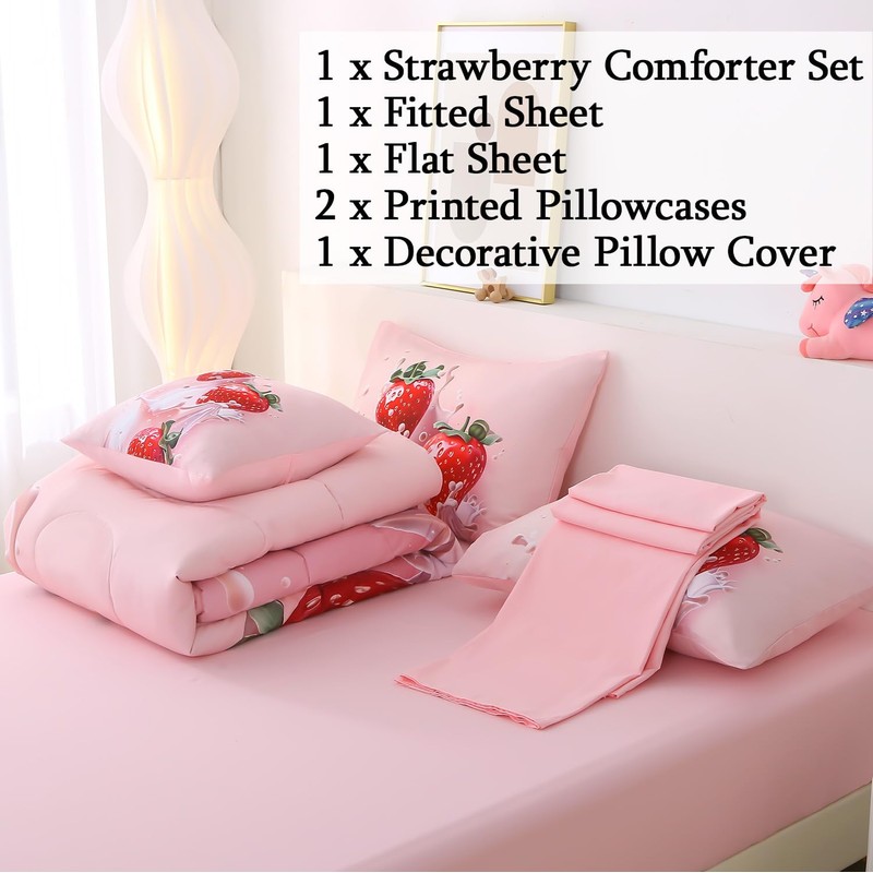 - 【Perfect Gift Choice】The strawberry theme 6 piece kids bed in a bag offers a variety of sizes and colors to suit different bed types and personal preferences. Perfect for decorating any bedroom, kids room, guest room, dorm, RV or vacation home. Great gift for girls and kids on Birthday, Thanksgiving , Christmas and Valentine's Day.