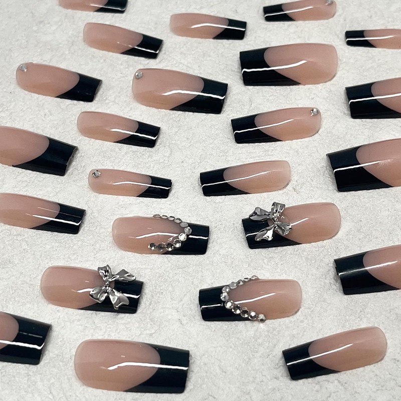 - Package: You will get 12 different sizes black french tip with silver bow charms design press on nails art 24pcs set, including a nail file, 24 pieces of jelly glue and a nail remover bar. This product does not carry glue due to transportation. Jelly glue is only suitable for temporary use. It is recommended to purchase professional glue for false nails