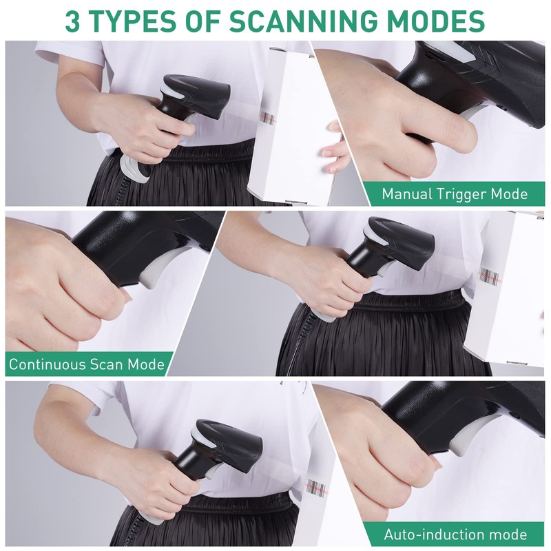 - 【Three Scan Modes】The wired barcode scanner has automatic identification mode, continuous mode and button trigger mode. If you set the QR code scanner to automatic detection or continuous mode, you do not need to press the button to scan, especially suitable for warehouses, express deliveries, supermarkets, convenience stores, this is your better choice.