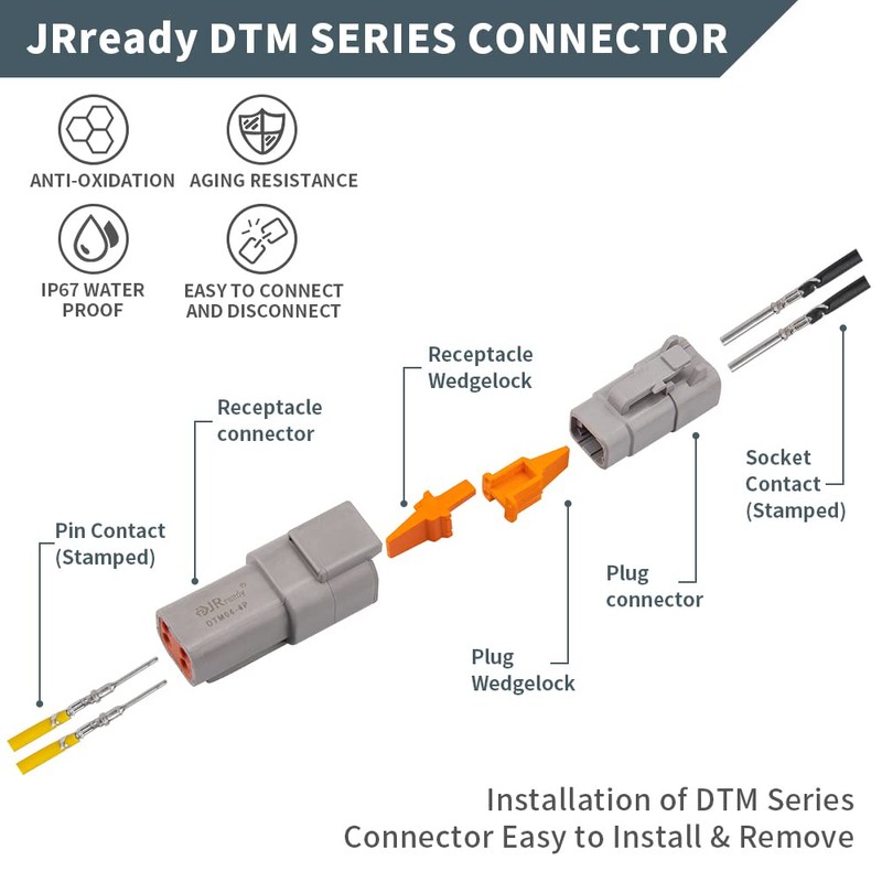 - DTM Series Connector Versatility: JRready connectors suitable for various waterproof electrical connections of motorcycle, scooter, car, truck, quad bike, caravan, marine, jet ski, boats.