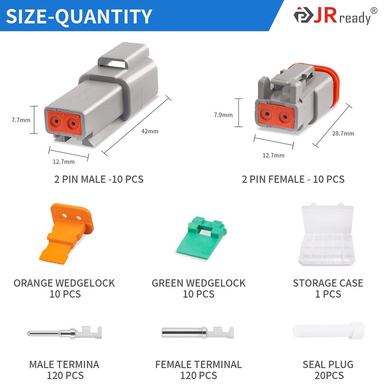 - 【Versatile & Reliable】 JRready DEUTSCH DT connectors offer field-proven reliability and rugged quality and are widely used in truck, bus, off-highway, construction, agriculture, mining, emergency vehicles, forestry, recreational, marine and motorcycle applications.