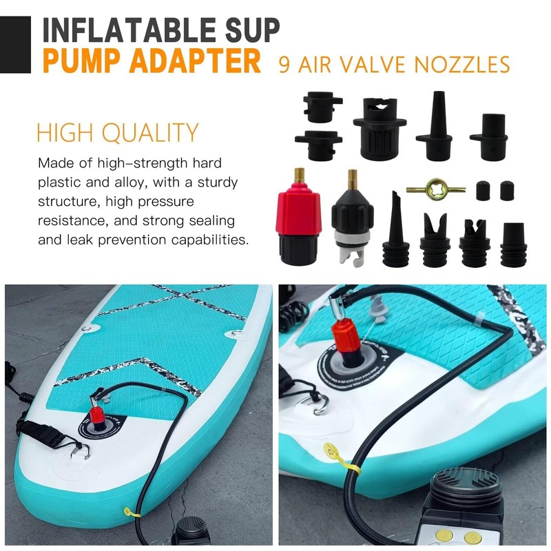 - Package Included: 2 paddle board pump adapters and 9 air pump adapter nozzles, wide variety of adapters can meet the inflation requirements of most devices. This sup valve adapter set can inflate most boats and inflatable beds. With this paddle board air pump adapter, there is no need to carry different types of special inflation tool