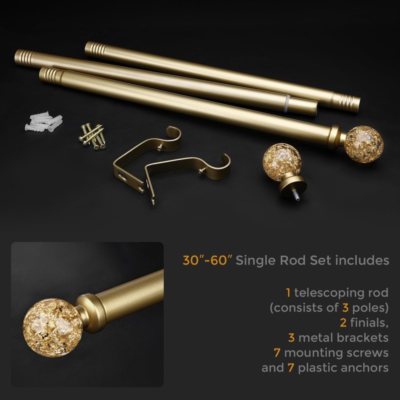 JRZOO Gold Curtain Rods for Windows 28 to 48 Inch, 1'' Heavy Duty Adjustable Drapery Rod with Unique Crystal Ball Finials, Modern Decorative Curtain Rod,Size; 30-60''