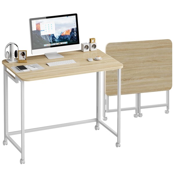 JSB Small Folding Computer Desk with Storage Bag and Hook Writing Modern Industrial Work Table Laptop for Home Office White (Natural & White, 31.5")