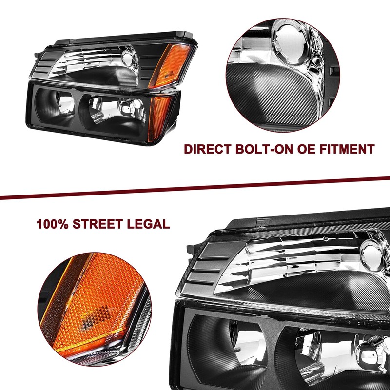 JSBOYAT 4pcs Headlight Assembly Replacement for 2002 2003 2004 2005 2006 Chevy Avalanche BODY CLADDING with Bumper Lights Headlamp (Black Housing with Amber Reflector Bulbs Included)