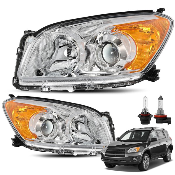 JSBOYAT Halogen Headlight Assembly for 2009-2012 Toyota Rav4 Driver and Passenger Side Chrome Housing with Amber Reflector (Bulbs Included)