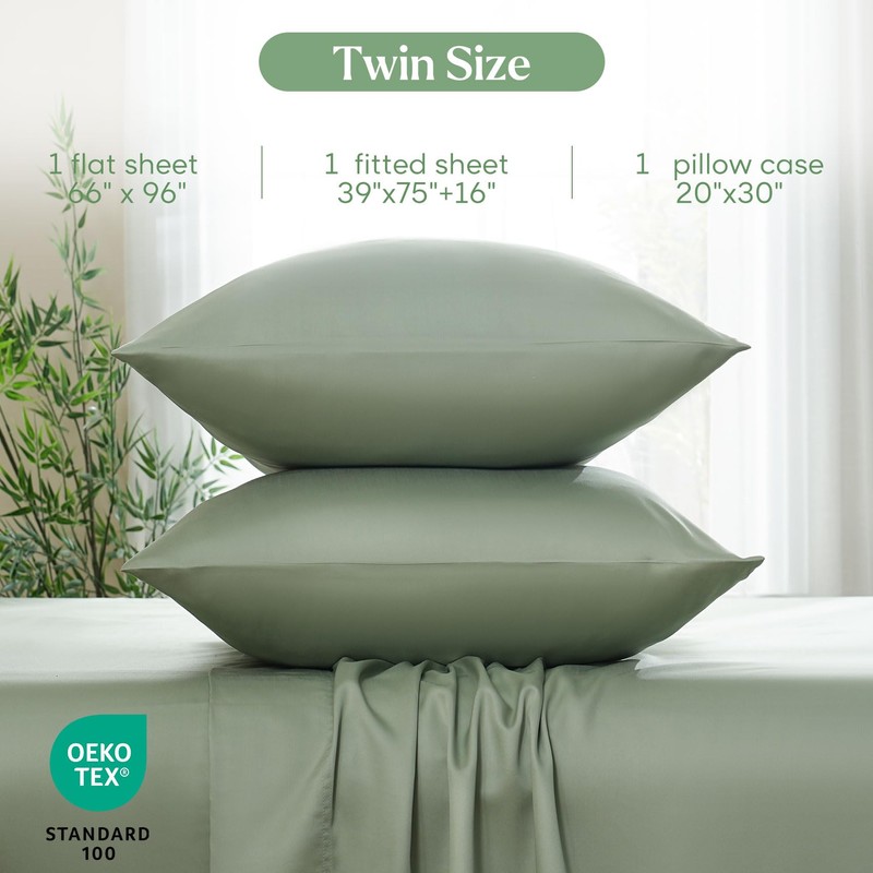 JSD Sage Green 100% Viscose Derived from Bamboo Sheet Set Twin, Cooling Sheets for Hot Sleepers, Soft Silky Breathable Bed Sheets Extra Deep Pocket