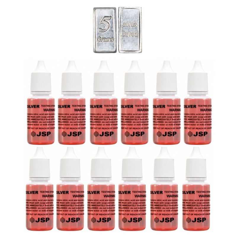 You will receive 12 bottles of JSP Silver Testing Acid and 1 - 5 Grain Solid Silver .999 Bar used to determine the Silver content of the piece being tested.