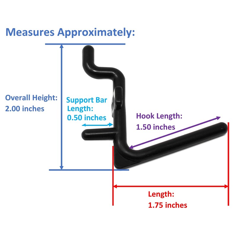 These L Style Pegboard Hooks are Non-Locking, heavy duty and fit ¼ inch pegboard holes (pegboard is not included). They are easy to install, and even easier to remove no more damaged pegboard. The support bar and the side wings allow for stabilization of the hook. Easily organize your jewelry, craft room or tools in your home, shop or garage.