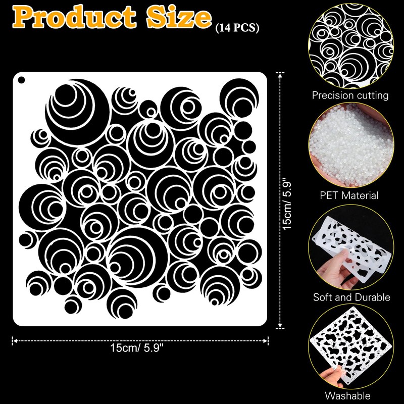 - Package contents: you will receive 14 artist stencils in different designs and 1 metal opening ring, each stencil is 6 x 6 inches.