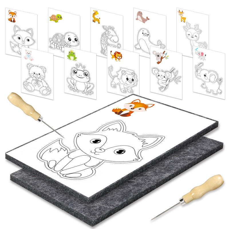 • Children's Pricking Needle Set: 2 Pricking felt (size: 15 x 20 x 1 cm), 2 pricking needles and 10 embroidery pictures for children. Ideal for beginners and advanced hobbyists