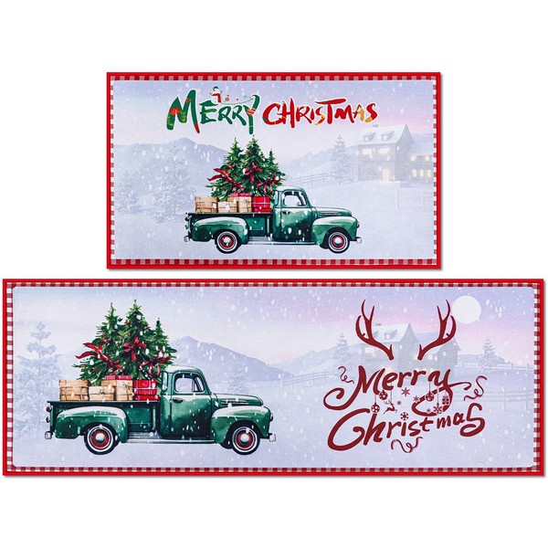 JSVSLTD Christmas Kitchen Rugs, Set of 2 Kitchen Floor Mat Christmas Decorations for Home, Non-Slip Anti Fatigue Kitchen Mats (17"x47"+17"x29", Christmas Truck)
