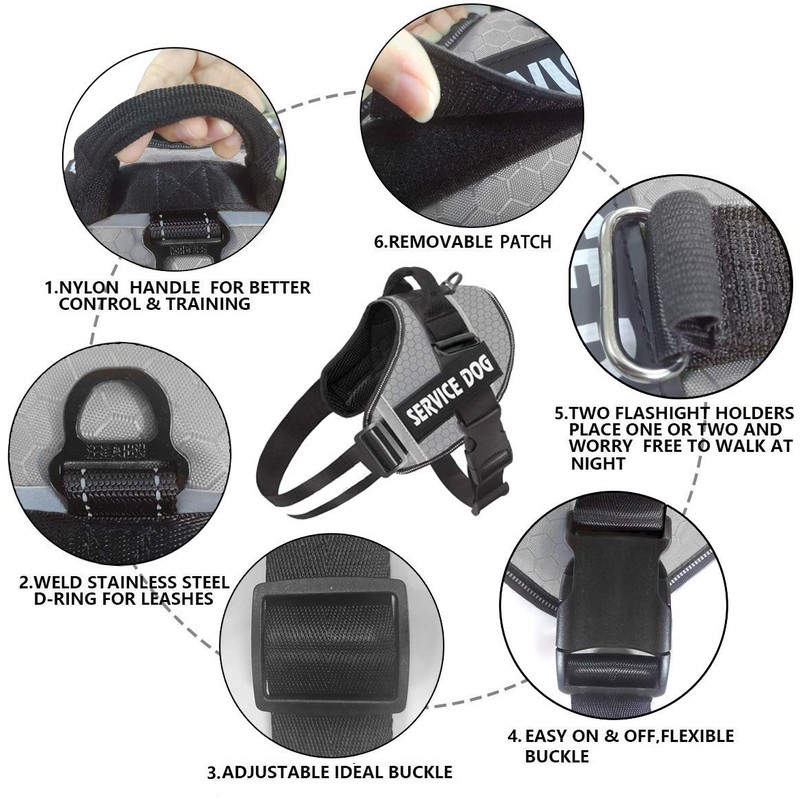 - 【Adjustable Chest Strap & Easy to Use】The service dog vest have a adjustable chest strap with one strong release buckle.The fit of this pet harness can be completely customized for your pet using the slide adjusters at the chest and neck.Hassle Free Overhead Harness is easy to put on and off with its fast-release buckles. Slide the harness over your dog's head,buckle it up,adjust the straps, and here you go! Grab the top handle for additional control. No worries about slipping out or choking.