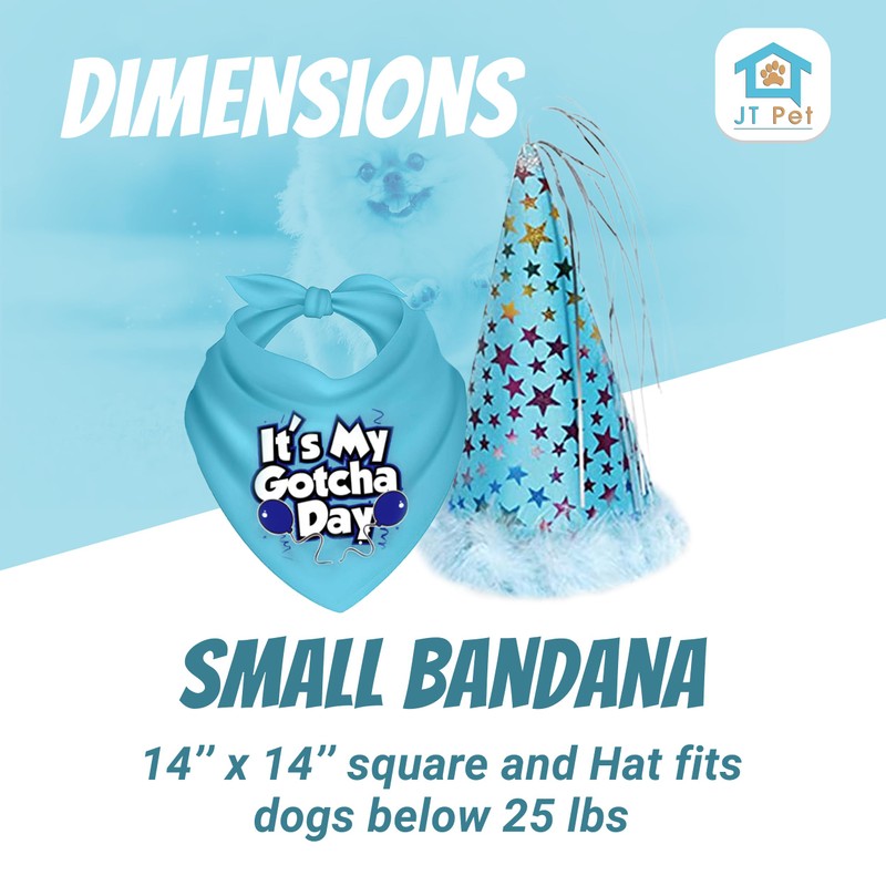 - FITS SMALL SIZED PETS: The 14”x 14” blue Bandana has a vibrant screen-printed It’s My Gotcha Day with balloons design. Can be easily folded in half to create the triangle look needed. Roll the bandana until the desired length & then tie around your dog’s neck.