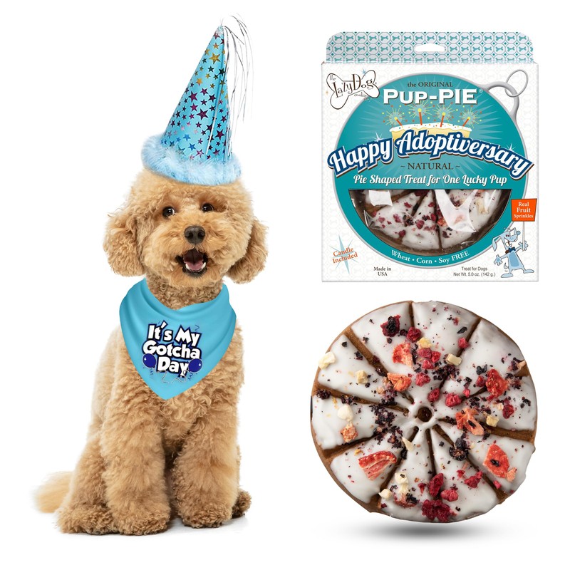 - PET DOG GOTCHA DAY BUNDLE SET: Pet party pack includes a Gotcha Day Bandana, a Star-Spangled topper hat, & a 6” vegan pie shaped treat.