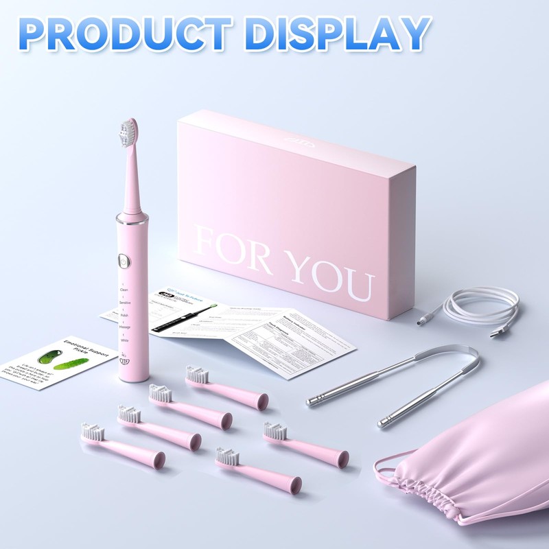 - [Package Content] 1 electric toothbrush ,6 brush heads,a user manual,1 Tongue Scraper,1 Cute Pickle Design Pocket Hug Card and a year of manufacturer's warranty.