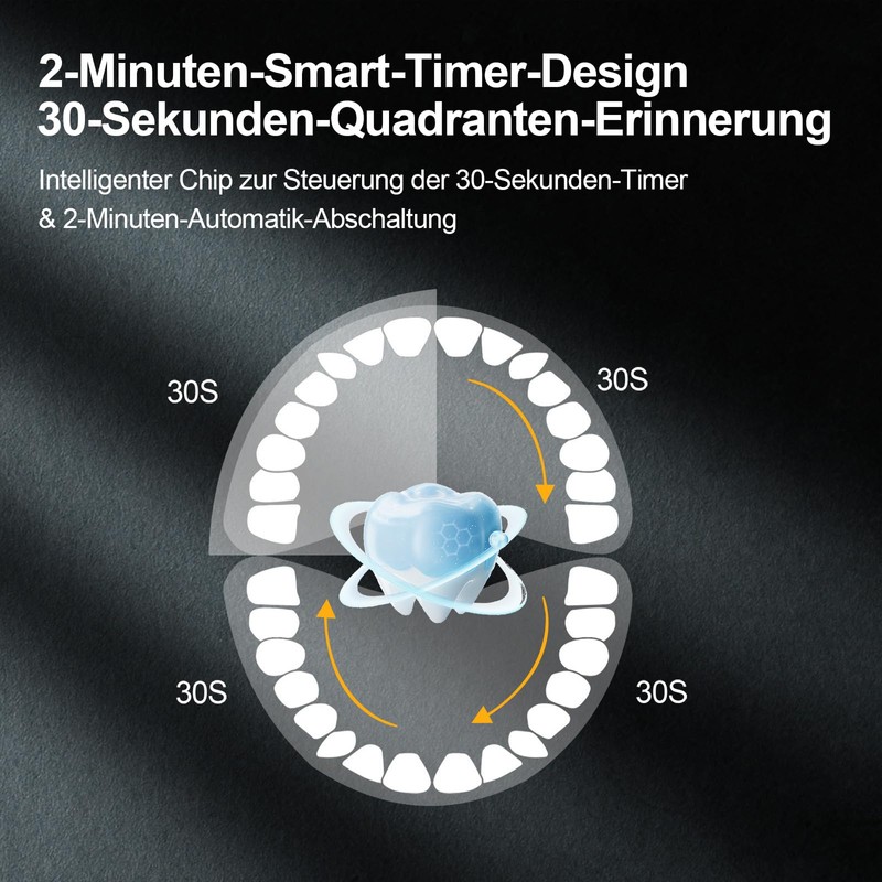 • 【2-Min-Smart-Timer & Quadrantenerinnerung – Gründlich Putzen】: Der integrierte 2-Minuten-Timer mit 30-Sekunden-Vibrationen führt Sie sicher durch das Putzen und erinnert an den Wechsel der Mundquadranten. So erreichen Sie eine gleichmäßige, gründliche Reinigung – einfach und effektiv.