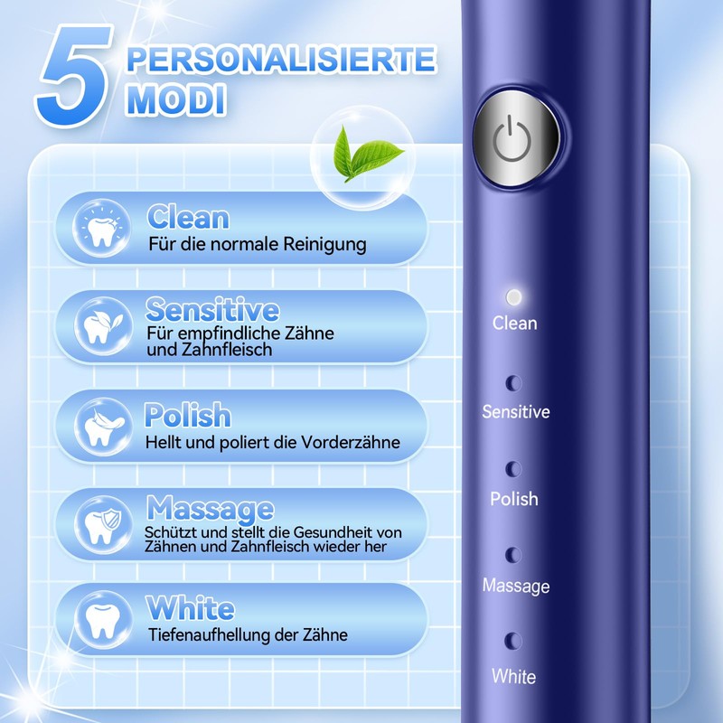 • 【5 Smart-Modes + Smart Memory】: Genießen Sie maßgeschneiderte Mundpflege mit 5 Reinigungsmodi (Weiß, Zahnfleischschutz, Sensitiv etc.), die sich automatisch an Ihre Bedürfnisse anpassen. Die Smart-Memory-Funktion merkt sich Ihre letzte Einstellung – für sofortige, personalisierte Reinigung bei jedem Einsatz.