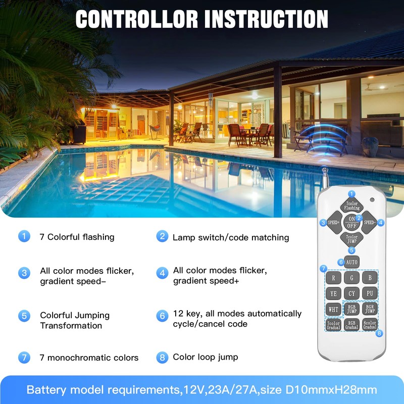 - 【Two Remote Controls & Switch Control】: No remote control around, No problem! The color mode of the pool bulb can also be changed by switching the power supply. Note: The remote control needs to buy a battery (Search for "12V 23A/27A"), If the bulb is installed underwater more than 3 feet or the bulb is sealed in an all-metal fixture, the signal will be greatly attenuated or lost.