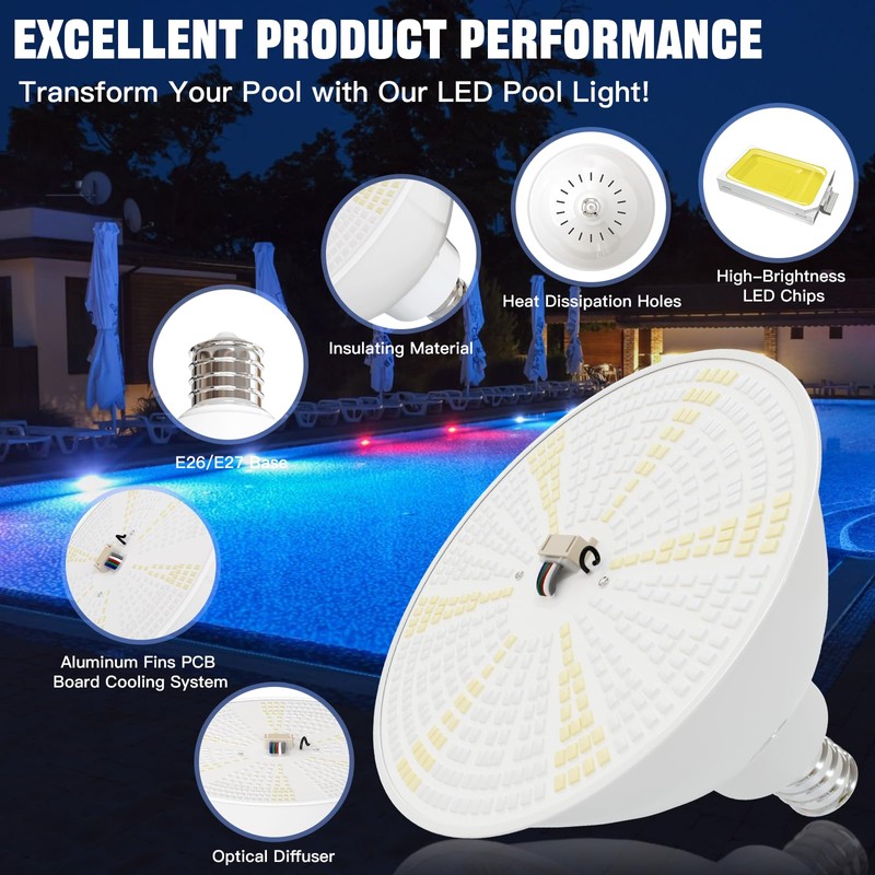 - 【Super Bright & Energy Saving】: The 35W pool light bulb with 480 Pcs top led chips throw out total 5250 lumens , color changing light for your pool, providing the first-class inground pool lighting experience. Equivalent to 600W pool bulb, it also saves your electricity bill by more than 80%.