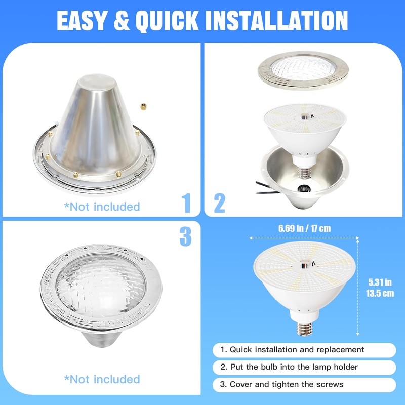 - 【Super-simple to Screw In】: Replacing your older and less efficient lights. Fits fixtures that have a 6.75" diameter opening and a e26 medium socket base. Compatible with most Pentair Amerlite 789 790 791 series, Hayward Astrolite SP058 series, and other E26 Screw.