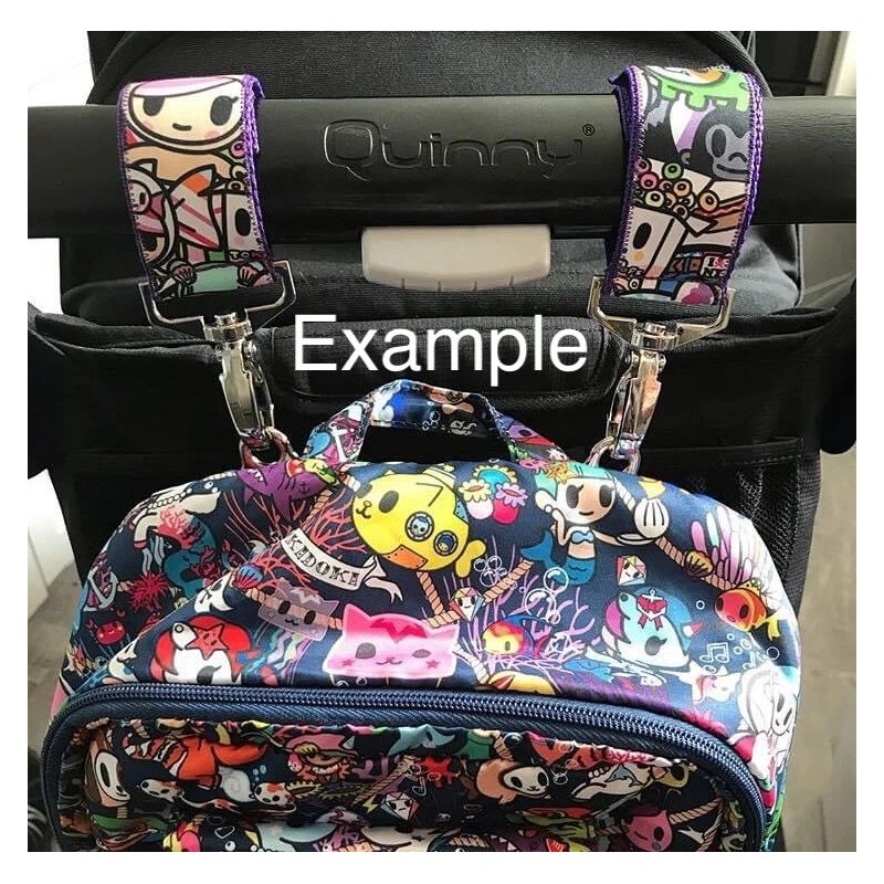 First photo is what you will receive. Second photo is example on how they attach to a stroller with bag. Good for all Ju Ju Be bags!