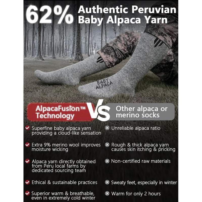 - 【Premium Baby Alpaca Comfort】; Experience the unparalleled softness and warmth of our socks, made with 62% baby alpaca yarn. Renowned for its skin-friendly properties and exceptional temperature regulation, baby alpaca provides all-day comfort, even in extreme cold weather. Indulge in the perfect balance of luxury and durability with every step you take.