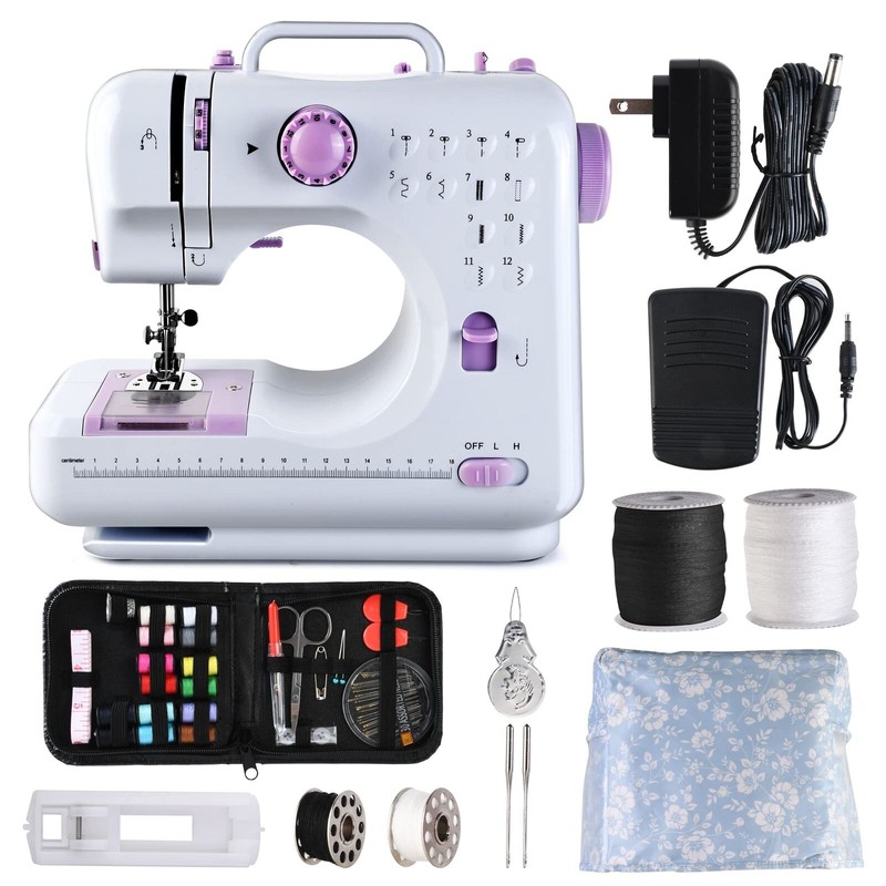 Mini Sewing Machine for Beginners and Kids Ages 8-12, Portable Sewing Machines with 12 Built-in Stitch Patterns, Light, 2 Speed Foot Pedal - Purple & White (with 27 Pieces Accessory Kit & Case)