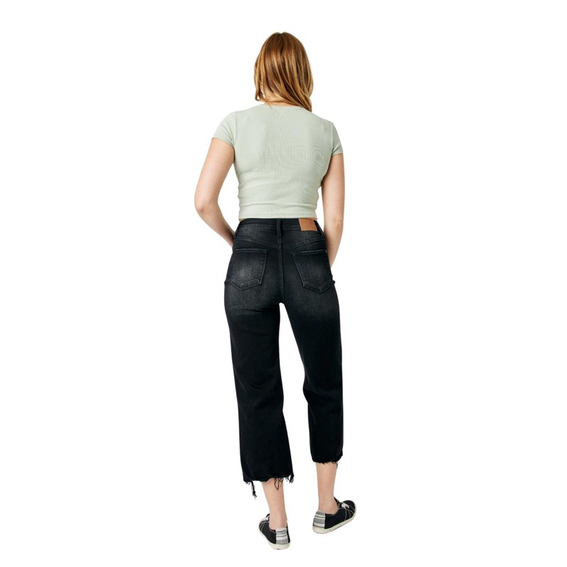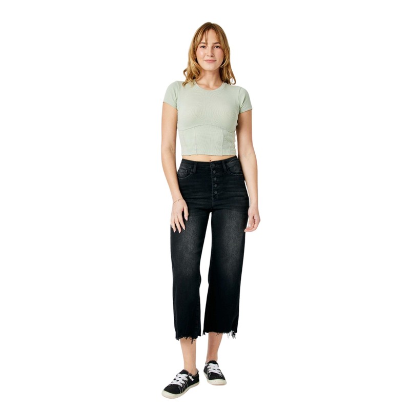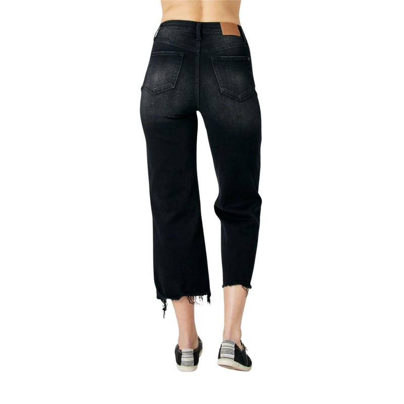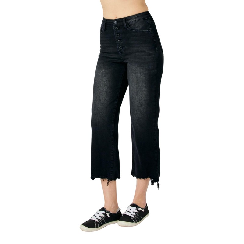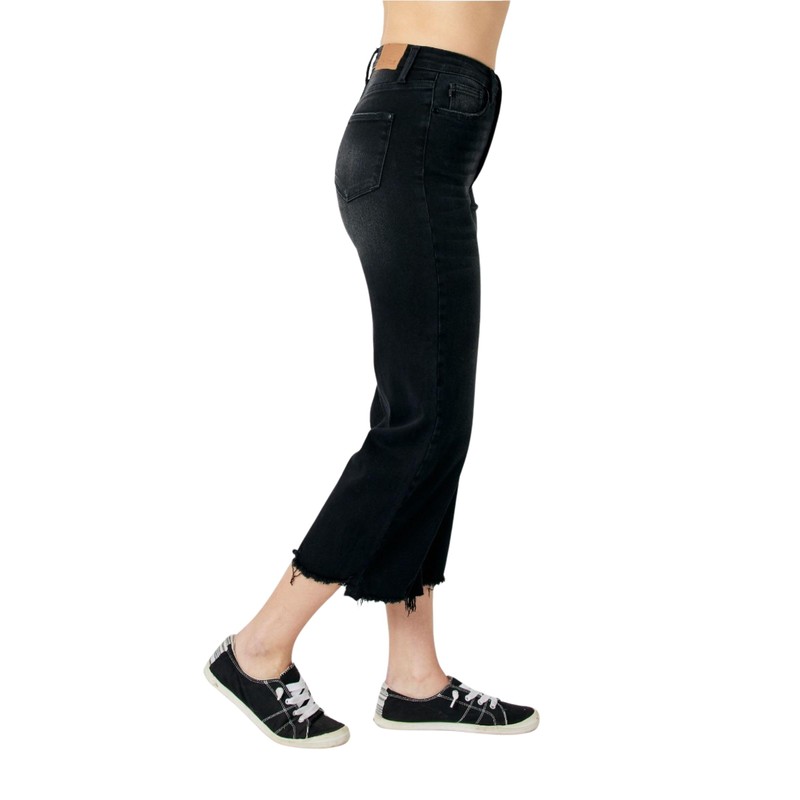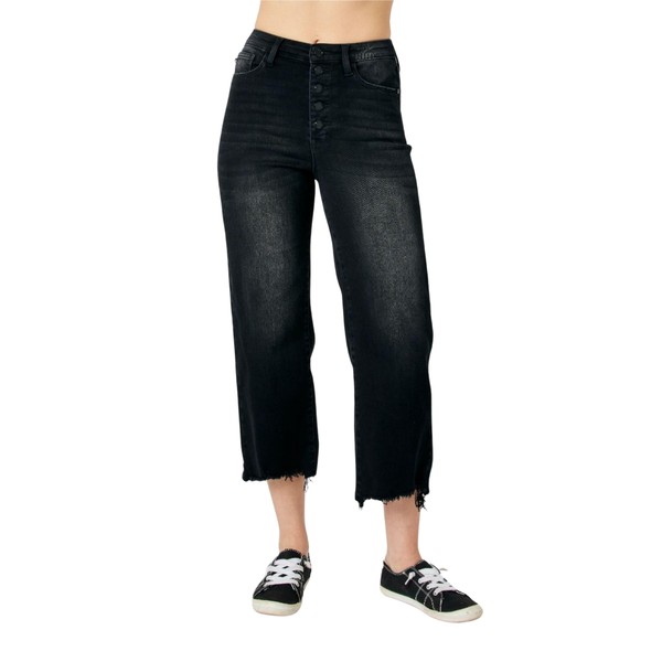 Judy Blue High Waist Distressed Raw Hem Wide Leg Crop Jeans (Black, 9)