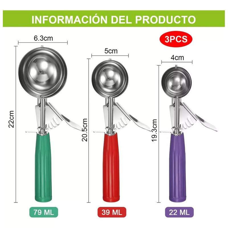 * Tres tamaños diferentes para satisfacer las diferentes necesidades: Verde: Gran cuchara (Longitud: 22.8 cm, diámetro: 6.3 cm, capacidad: 79ml) Rojo: cuchara mediana (longitud: 21.5 cm, diámetro: 5 cm, capacidad: 39ml) Púrpura: cuchara pequeña (longitud: 20.8 cm, diámetro: 4 cm, capacidad: 22 ml)..