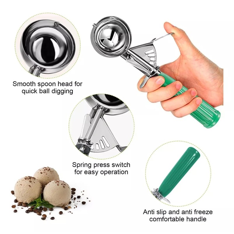 Juego 3 Cucharas de Helado,Premium Acero Inoxidable MecáNico Cookie Cuchara MelóN Baller Con Disparador, Cucharas Resortes Scoop P/Helado Profesional Acero Para Helado Frutas Galletas De Mash