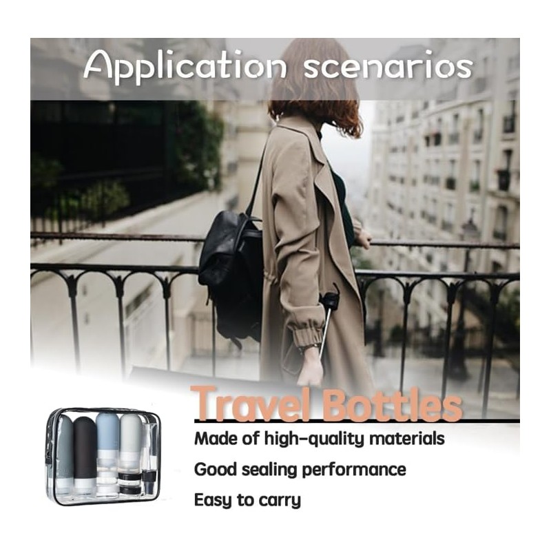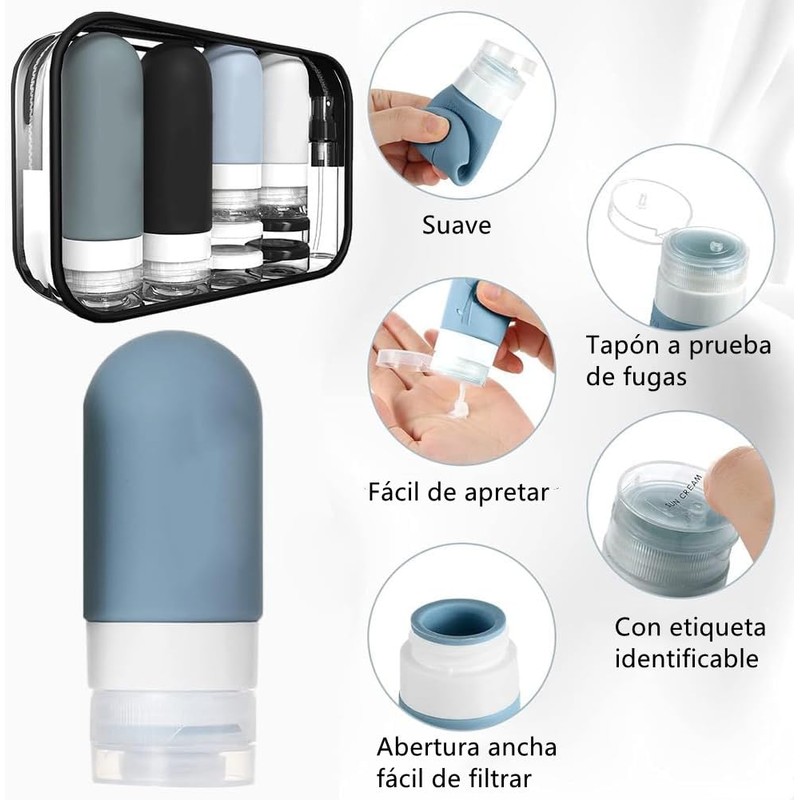 - 【Juego de 17 accesorios de viaje】Nuestro set de botellas de viaje incluye 1 bolsa impermeable, 2 botellas de silicona (3.04oz/90ml), 2 botellas de silicona (2.03oz/60ml), 4 tarros de crema, 2 atomizador de perfume de 60 ml, 1 embudo, 1 etiquetas, cepillo y 4 espátulas. Una variedad de contenedores le permiten llevar diferentes productos de belleza y artículos de tocador según sea necesario.