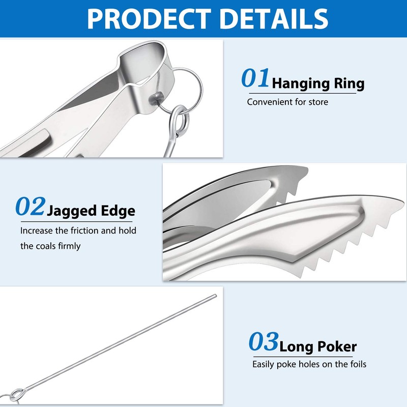 Las pinzas de acero inoxidable para accesorios de cachimba están diseñadas con bordes dentados, lo que puede aumentar la fricción y sostener los carbones firmemente, y los pokers largos pueden fácilmente meter agujeros en las láminas, lo que le brinda mucha comodidad. Con un pequeño anillo en la parte superior, puede colgar las pinzas de la pipa de agua en paredes, puertas y otros lugares adecuados, conveniente para almacenar sin ocupar mucho espacio.