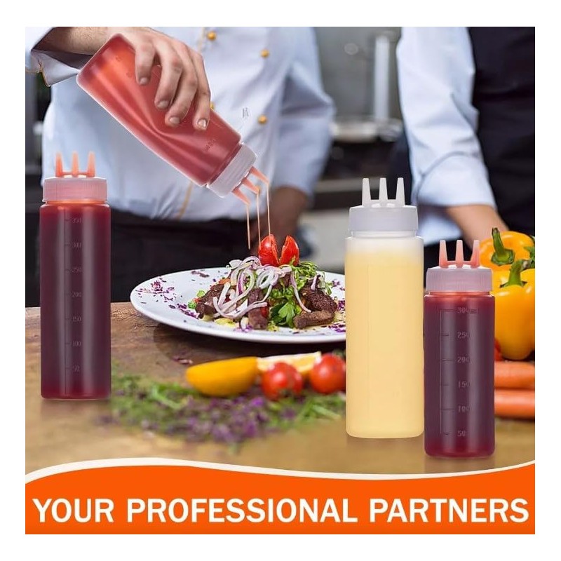 - Diseño de 3 orificios: esta botella exprimible con 3 orificios puede brindarle un gran control sobre la distribución de salsa de tomate, mostaza, aderezo para ensaladas y más. La tapa evita derrames y mantiene el contenido fresco.