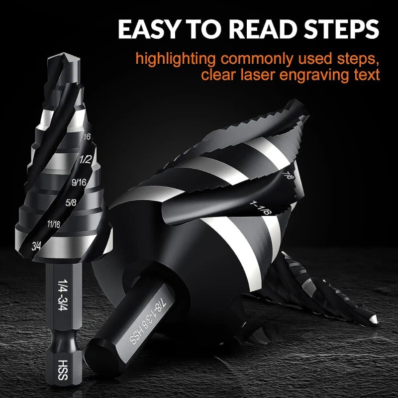 - Cada broca está construida con HSS de grado industrial con revestimiento negro de nitruro y pulida.
