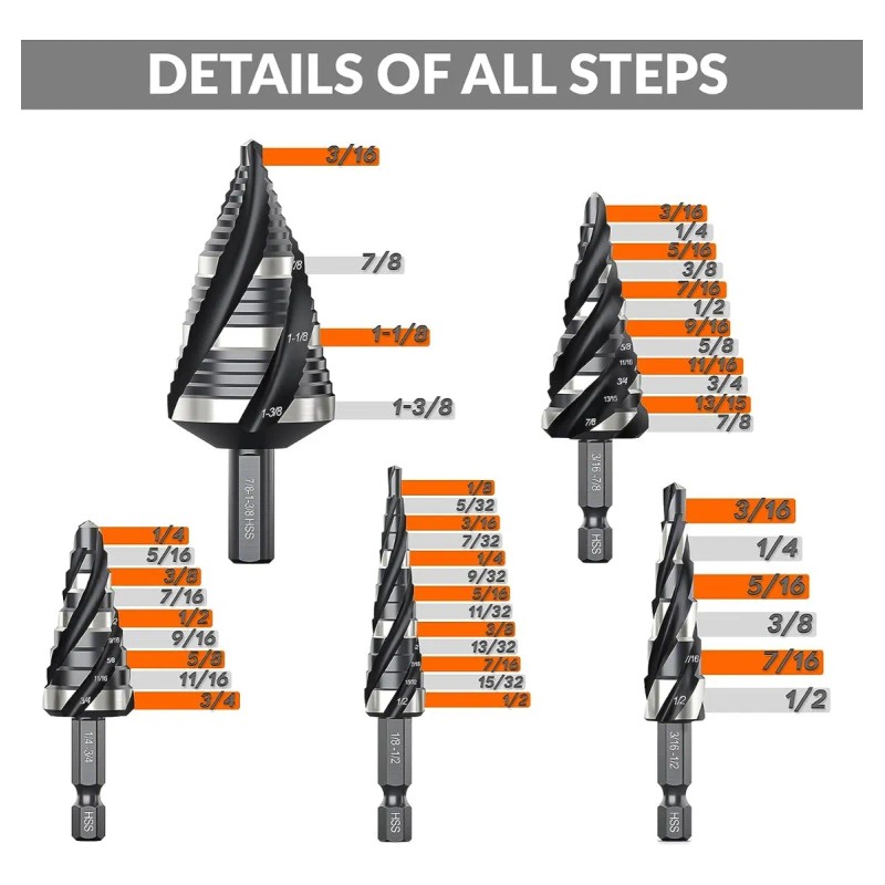 Descripción Limpia: Este juego de brocas escalonadas para metal de 5 piezas contiene un total de 59 tamaños: